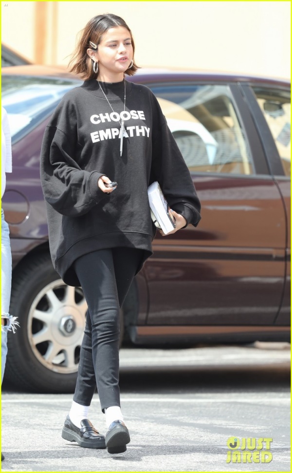 အသက်(၂၅)နှစ်အရွယ် ဆလီနာဟာ Choose Empathy ဆိုတဲ့ စာတန်းပါတဲ့ အနက်ရောင် အင်္ကျ ီအပွကြီးကို ဝတ်ဆင်ထားခဲ့ပြီး မတ်လ(၂၅)ရက်နေ့က သူငယ်ချင်းတွေနဲ့အတူ Studio City နားမှာ တွေ့ဆုံခဲ့ပါတယ်။