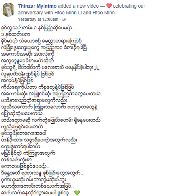 ချစ်သက်တမ်းတစ်နှစ်ပြည့်မှာ အမှတ်တရဖြစ်အောင် ဘုရားသွားကုသိုလ်ယူခဲ့တယ်လို့လည်း သင်ဇာမြင့်မိုရ် က သူမရဲ့ ဖေ့ဘုတ်အကောင့်မှာ မျှဝေထားပါတယ်။