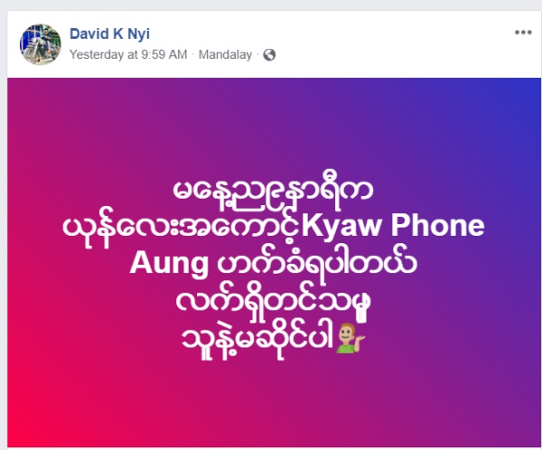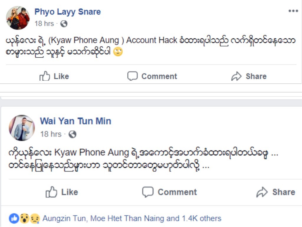အနုပညာကို လွတ်လွတ်လပ်လပ် ဖော်ထုတ်တတ်တဲ့ ယုန်လေးတစ်ယောက် ရဲ့ Facebook အကောင့် ကို ပြီးခဲ့တဲ့ စနေနေ့ က ဟက်ကာ တစ်ယောက်က Hack ခဲ့တာလည်းဖြစ်ပါတယ် ။ Hack ခံရပြီး နောက်ပိုင်းမှာ ယုန်လေး ရဲ့ Account က Profile နဲ့ Cover တွေကို ယုန်ပုံတွေပြောင်းပြီး Status တွေကိုလည်း အင်္ဂလိပ်လိုရေးသားပြီး တင်ခဲ့တာပါ။ လတ်တလောမှာ ယုန်လေးအကောင့်မှာ အဓိပ္ပါယ်မရှိတဲ့စာတွေတင်နေခဲ့တာမို့ ယုန်လေးရဲ့ သူငယ်ချင်းတွေဖြစ်ကြတဲ့ ဂျိုကာ၊ ဖြိုးလေး (Snare) နဲ့ ဟာသသရုပ်ဆောင် Kညီ တို့ က ယုန်လေးအကောင့်အဟက်ခံရခြင်းနဲ့ တင်သမျှစာတွေဟာ ယုန်လေးနဲ့မသက်ဆိုင်ကြောင်းရေးသားပြီး ပရိသတ်တွေကို အသိပေးခဲ့ပါတယ်။
