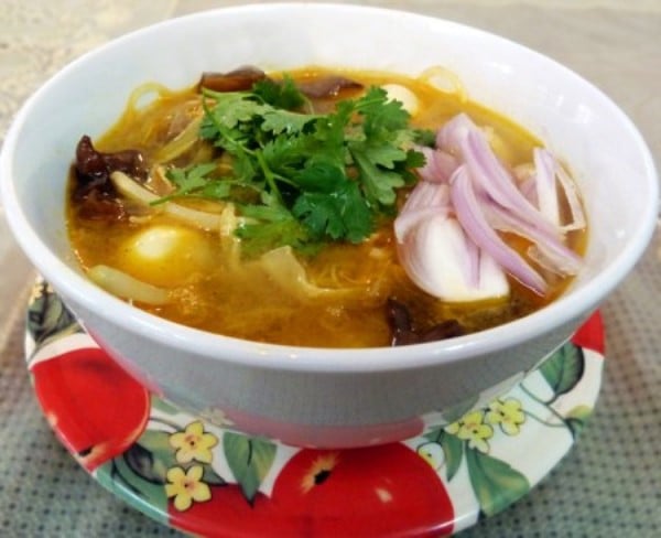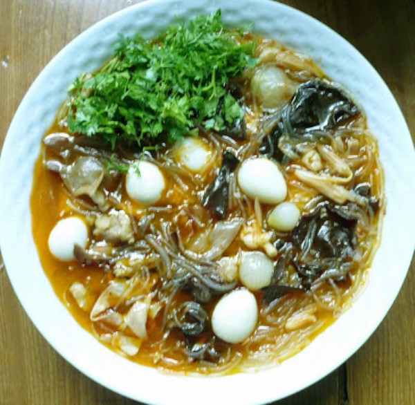 - အသားပြုတ်ရည်ကို ဆူအောင် တည်ပြီးနောက် ကြက်သားဆီသတ်၊ မှိုခြောက်၊ ပန်းခြောက်၊ ပဲလိပ်၊ ငုံးဥတို့ ရောထည့်ပြီး ခဏထားပါ။