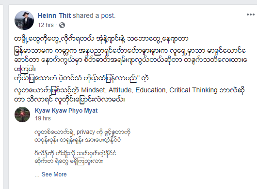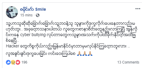 ယခုလက်ရှိ ဟိန်းမင်းသူရဲ့ ဖေ့စ်ဘုတ်အကောင့်မှာ ဟက်ကာတွေ တင်ထားခဲ့တဲ့ ပို့စ်တွေကို ပြန်ဖျက်ထားတာ တွေ့ရပါတယ်။ ဟိန်းမင်းသူဟာ အောက်တိုဘာလ ၉ ရက်နေ့က Heart Attack ဖြစ်လို့ ရုတ်တရက် ဆေးရုံတင်ထားရတဲ့လို့ သိရပြီး နောက်ပိုင်းမှာ ဒီလိုကိစ္စတွေ ဆက်တိုက်ဖြစ်ပေါ်လာခဲ့တာဖြစ်ပါတယ်။လက်ရှိအခြေအနေမှာ ဟိန်းမင်းသူရဲ့ အခြေအနေဟာ တည်ငြိမ်နေတယ်လို့သိရပြီး ဆေး့ုသမှုများဆက်လက်ခံနေရသေးတယ် လို့ သိရပါတယ်။ ပရိသတ်ကြီး ရော အွန်လိုင်းပေါ်က လူတစ်ယောက်ခြင်းစီရဲ့ ဝေဖန်မှုတွေက အသက်သေဆုံးတဲ့အထိဖြစ်စေနိုင်တာကို လက်ခံမခံ မှတ်ချက်မှာပြောပြခဲ့ကြပါနော်။