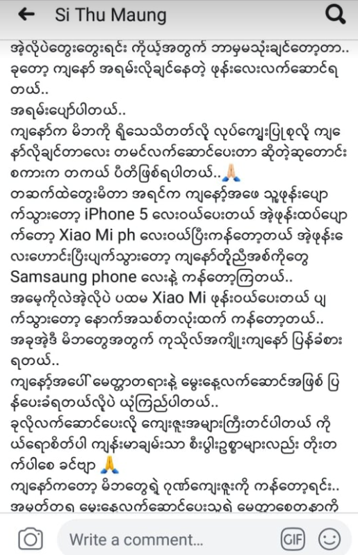ဒီအကြောင်းနဲ့ပတ်သက်ပြီး စည်သူမောင်က " Happy Birthday Surprise Gift to Me အရမ်းပျော်တယ်..ဟိုးအရင်ထဲက ကိုယ်ကချည်း သူများကို Surprise လုပ်ရတယ် မွေးနေ့ Anniversary စသဖြင့်ပေါ့ ကျနော့ကျ ဘသူမှမလုပ်ပေးကြဖူး..ခုတော့ မွေးနေ့လက်ဆောင် Surprise iPhone 7+ လေး လက်ဆောင်ရတယ်..ကျနော့ဖုန်း 6+ လေးက စထွက်ကထဲက ဝယ်ထားတာဆိုတော့ မော်ဒယ်လဲနိမ့် ကင်မရာရုပ်ထွက်လဲနိမ့် အတော်လည်းဟောင်းနေပါပြီ တရိုတသေကိုင်လို့သာ ခုလောက်အဆင်ပြေနေတာ..iPhone အသစ်ထွက်လာတိုင်း မကိုင်ချင်ပေမယ့် ဖုန်းအသစ်လေးတလုံးတော့ ထပ်လိုချင်ခဲ့တာ..အစစအရာရာချင့်ချိန်နေခဲ့ရတာ ခုဆို ပိုဆိုးတာပေါ့..ဖုန်းဝယ်ရင် ၁၀ သိန်း ဆို အမေ့အတွက် ဆေးတခါသွင်းလို့ရတယ်..သိန်း ၂၀ ဆို အဖေနဲ့အမေ ကို ဗုဒ္ဓဂယာ ဘုရားဖူးပို့လို့ရတယ်..အဲ့လိုပဲတွေးတွေးရင်း ကိုယ့်အတွက် ဘာမှမသုံးချင်တော့တာ..