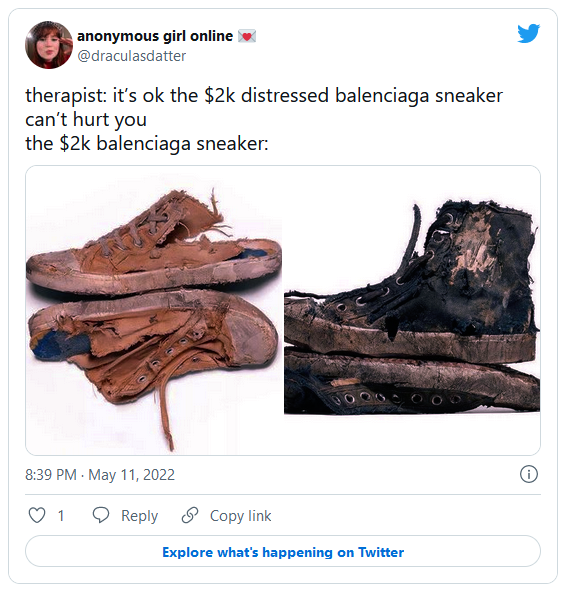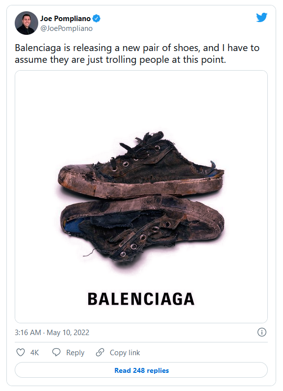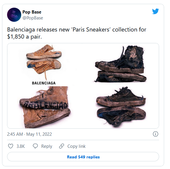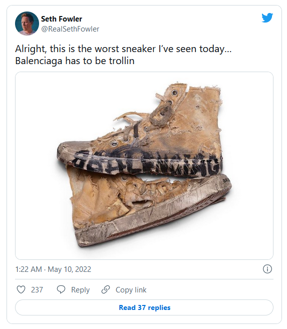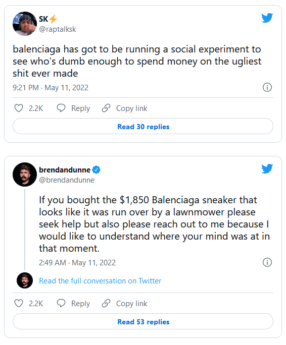 သင်ဘယ်လိုမြင်လဲပေါ်မူတည်ပြီး ဒါဟာ ကောင်းလား ဆိုးဝါးပါသလား? တွစ်တာအသုံးပြုသူတစ်ဦးက "Balenciaga က ဖိနပ်အသစ်တစ်ရံကို ထုတ်ပေးနေပြီး၊ ဒီအချိန်မှာ လူတွေကို လှည့်စားနေတယ်လို့ ကျွန်တော်ထင်ပါတယ်။" ဒုတိယအသုံးပြုသူတစ်ဦးက "Balenciaga ဟာ သူလုပ်ဖူးသမျှထဲ အရုပ်ဆိုးဆုံး s**t မှာ ပိုက်ဆံသုံးနိုင်လောက်အောင် ဘယ်သူက မိုက်မဲနေလဲဆိုတာ သိနိုင်ဖို့ လူမှုစမ်းသပ်မှုတစ်ခုကို လုပ်ဆောင်ရမှာ ဖြစ်ပါတယ်။" လို့ရေးသားထားပါတယ်။ ကောင်းမွန်းတဲ့ Comments တွေကိုလိုက်ရှာပေမယ့်လည်း လူတိုင်းက တူညီတဲ့ မှတ်ချက်တွေပဲ မန့်ခဲ့ကြပါတယ်။